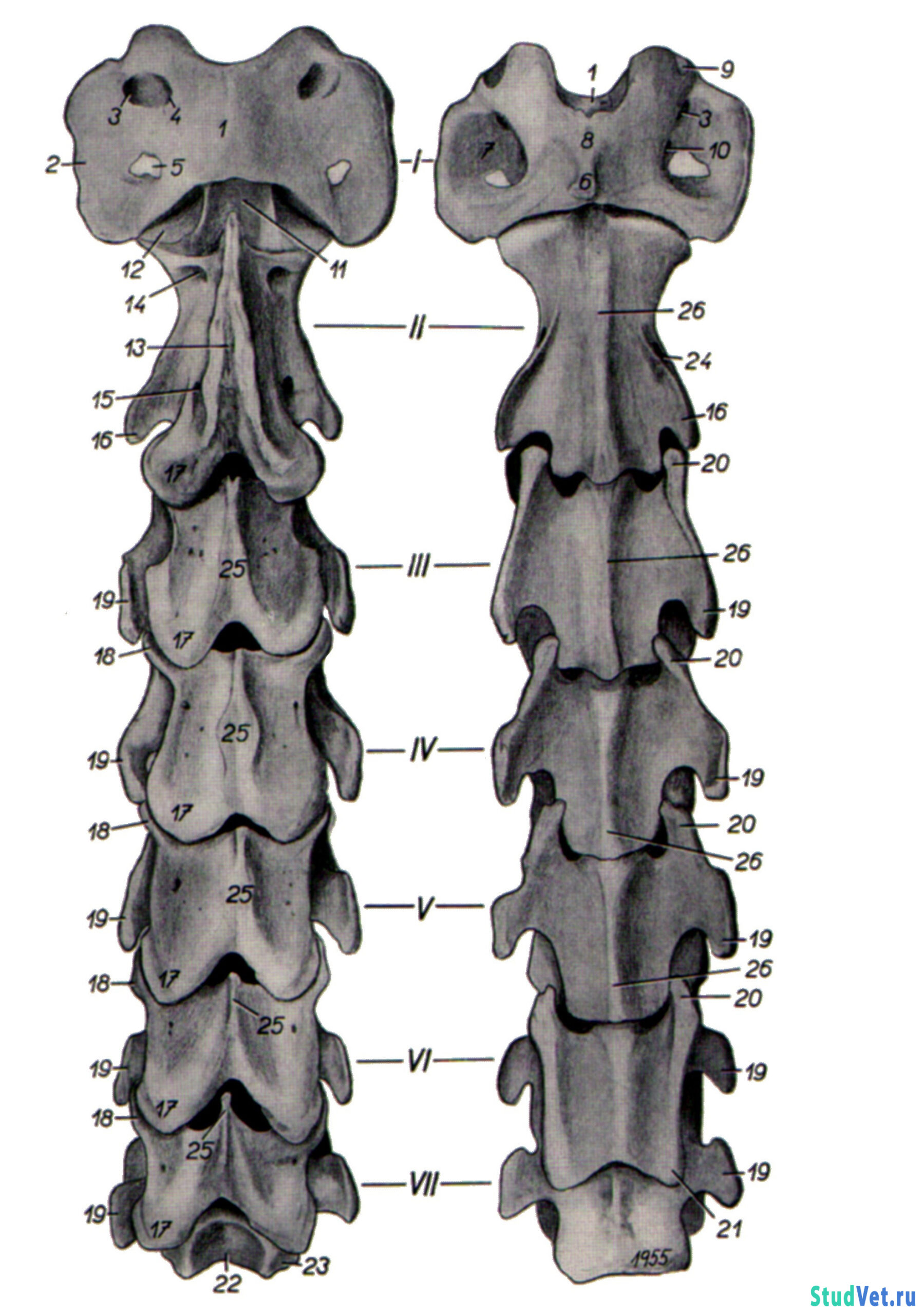 I—VII— шейные позвонки; I— атлант; II— эпистрофей; 1— дорсальная дуга атланта; 2— крыло атланта; 3— крыловое отверстие; 4— межпозвоночное отверстие атланта; 5— межпоперечное отверстие; 6— вентральный бугорок; 7— ямка атланта; 8— вентральная дуга; 9— краниальная суставная ямка; 10— питательное отверстие; 11— зубовидный отросток; 12— краниальный суставной отросток; 13— гребень эпистрофея; 14— межпозвоночное отверстие; 15— межпоперечное отверстие; 16— поперечный отросток; 17— каудальный суставной отросток; 18— краниальный суставной отросток; 19— дорсальный бугорок поперечнореберного отростка; 20— вентральный бугорок поперечнореберного отростка (реберный отросток); 21— каудальный вентральный бугорок поперечнореберного отростка; 22— ямка VII шейного позвонка; 23— каудальная реберная ямка; 24— межпоперечное отверстие; 25— остистый отросток; 26— вентральный гребень.